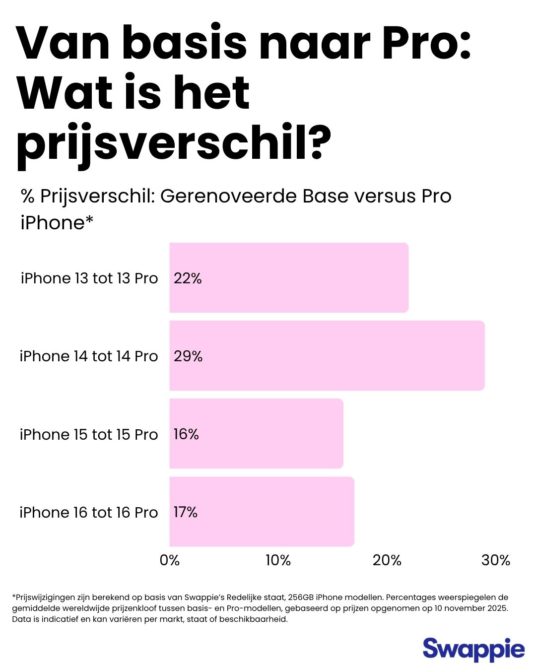 Pro gaan betekent niet de prijs verdubbelen. Wanneer je refurbished koopt, is de sprong kleiner dan je denkt. En als je het geld van je inruil toevoegt, wordt een Pro-model een eenvoudige, slimme keuze. De tabel hieronder laat zien hoeveel meer je moet uitgeven, in procenten, om te upgraden van een standaard refurbished iPhone naar de Pro-versie.