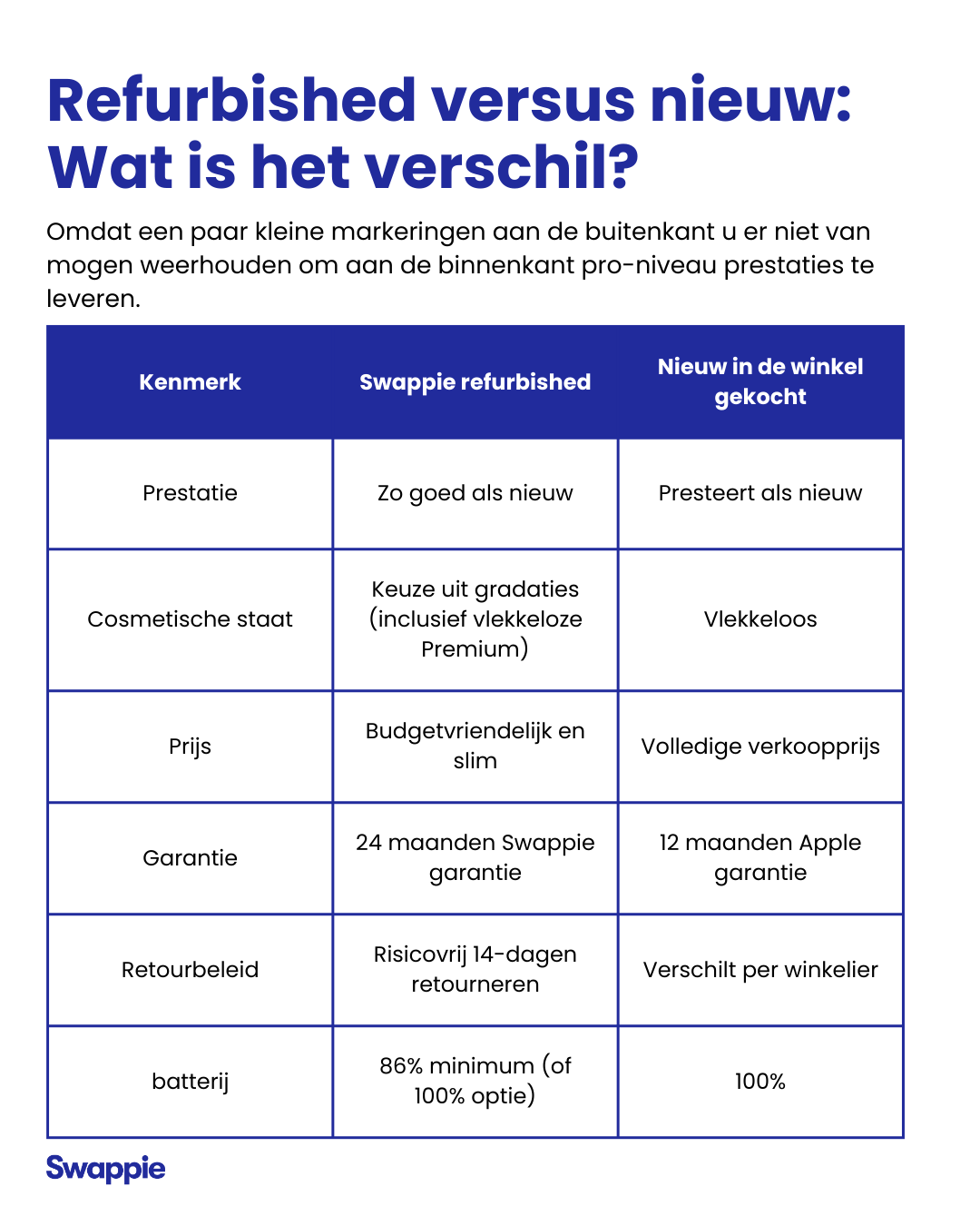 In een wereld waar nieuwe tech een flink prijskaartje heeft, is het tijd om te praten over wat echt telt: prestaties. Bij Swappie vinden we dat iedereen tech verdient waar ze zich goed bij voelen. Daarom presteren onze iPhones net zo goed als de exemplaren die je in een traditionele winkel vindt.