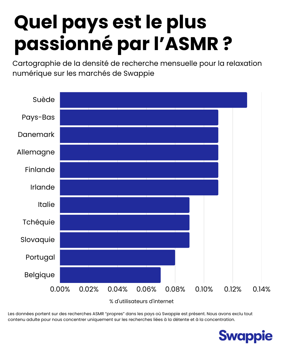 En comparant les volumes de recherche mensuels avec le nombre total d’utilisateurs en ligne sur les marchés actifs de Swappie, on a identifié les pays européens où la détente sonore est la plus populaire.