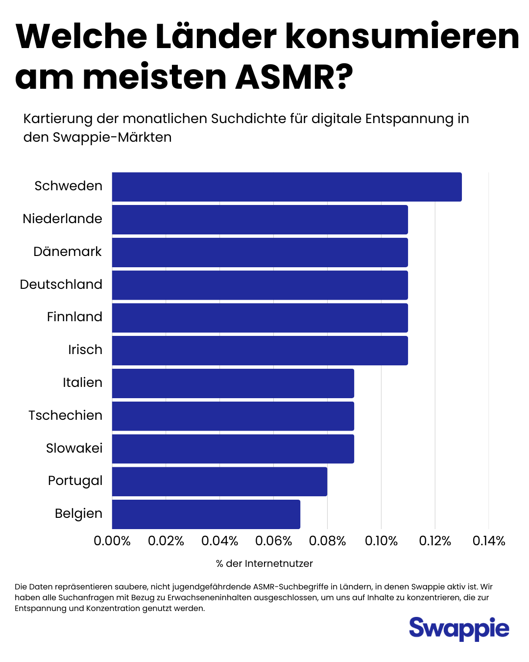 Wir haben nicht nur geschaut, wer am meisten sucht, sondern wer im Verhältnis zur Bevölkerung am besessensten ist. Durch den Vergleich des monatlichen Suchvolumens mit der Gesamtzahl der Internetnutzer in den aktiven Märkten von Swappie haben wir herausgefunden, wo die Fans von Entspannungsklängen in Europa wirklich konzentriert sind.