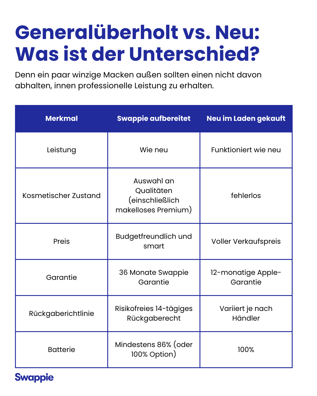 3. Speicher Der Speicher funktioniert exakt gleich, egal ob neu oder refurbished. Ein 128 GB Swappie iPhone bietet den gleichen schnellen Zugriff und die gleiche Kapazität wie ein Modell direkt aus der Fabrik.