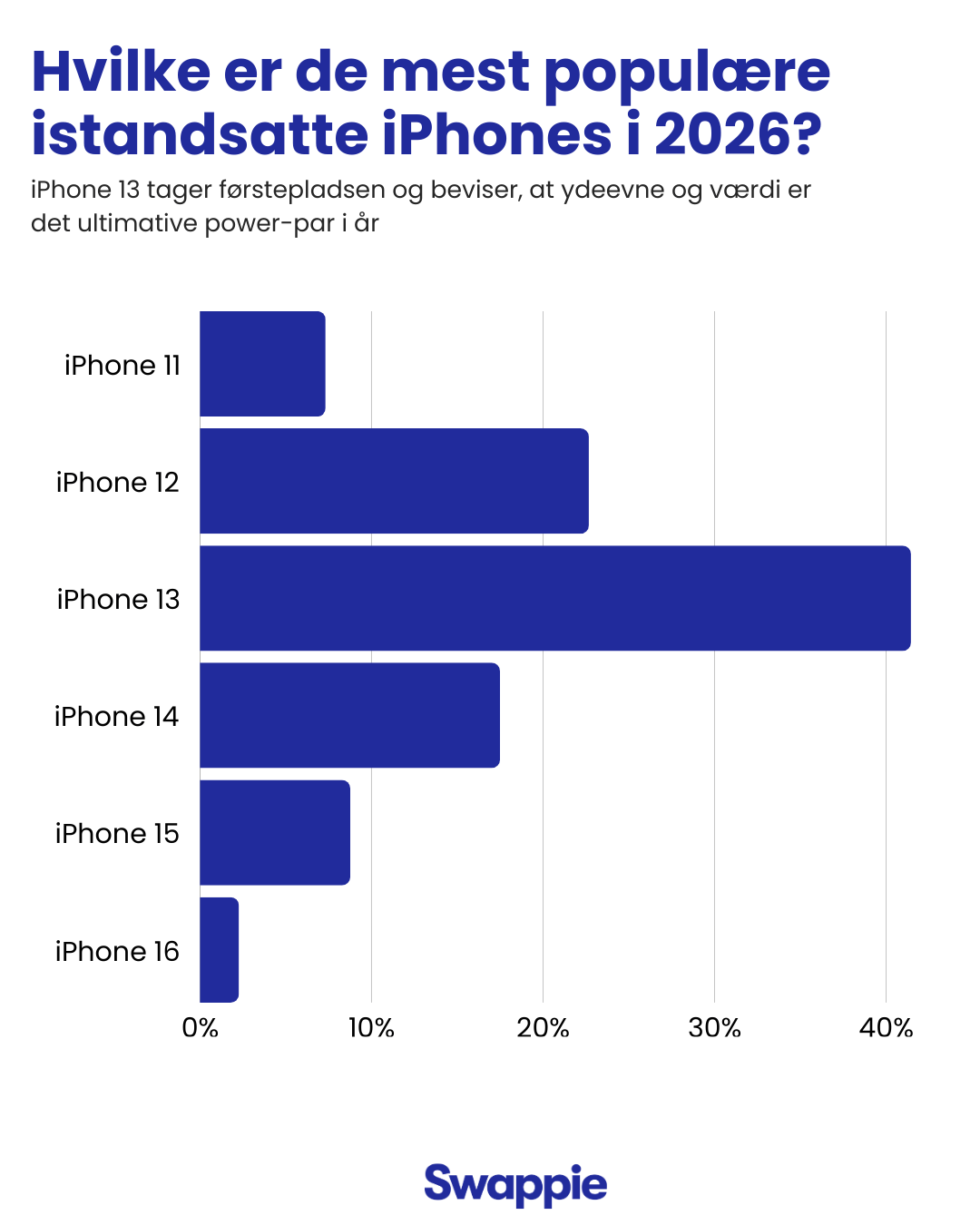 Når vi kigger på de mobiler, vores kunder lægger i kurven, er der én model, der stikker markant ud. iPhone 13 er i øjeblikket det mest populære valg blandt Swappies kunder, og det er med en betydelig margin.