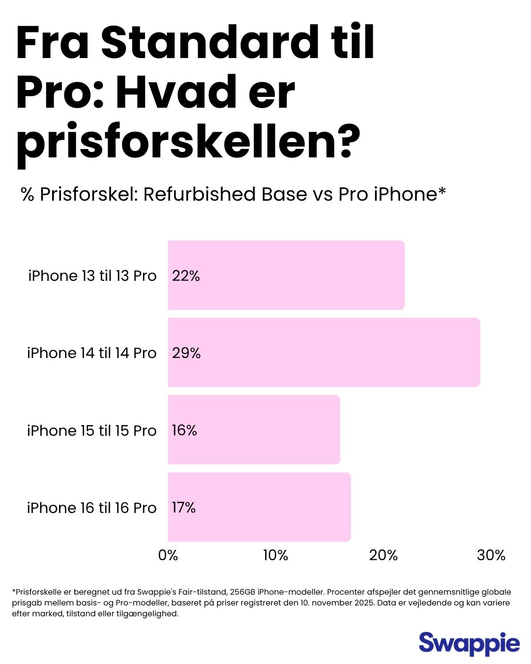 At gå Pro betyder ikke at fordoble prisen. Når du køber refurbished, er springet mindre, end du tror. Og når du tilføjer pengene fra dit bytte, bliver en Pro-model et simpelt, smart valg. Tabellen nedenfor viser, hvor meget mere du skal bruge, i procent, for at opgradere fra en standard refurbished iPhone til dens Pro-version.