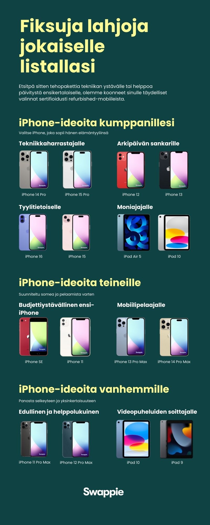 Jos puhelin ei tunnu oikealta ratkaisulta, harkitse sertifioitua kunnostettua iPadia. Se on täydellinen lahja opiskelijalle muistiinpanoihin, luovalle piirtäjälle tai perhekuvien katseluun suuremmalta ruudulta.