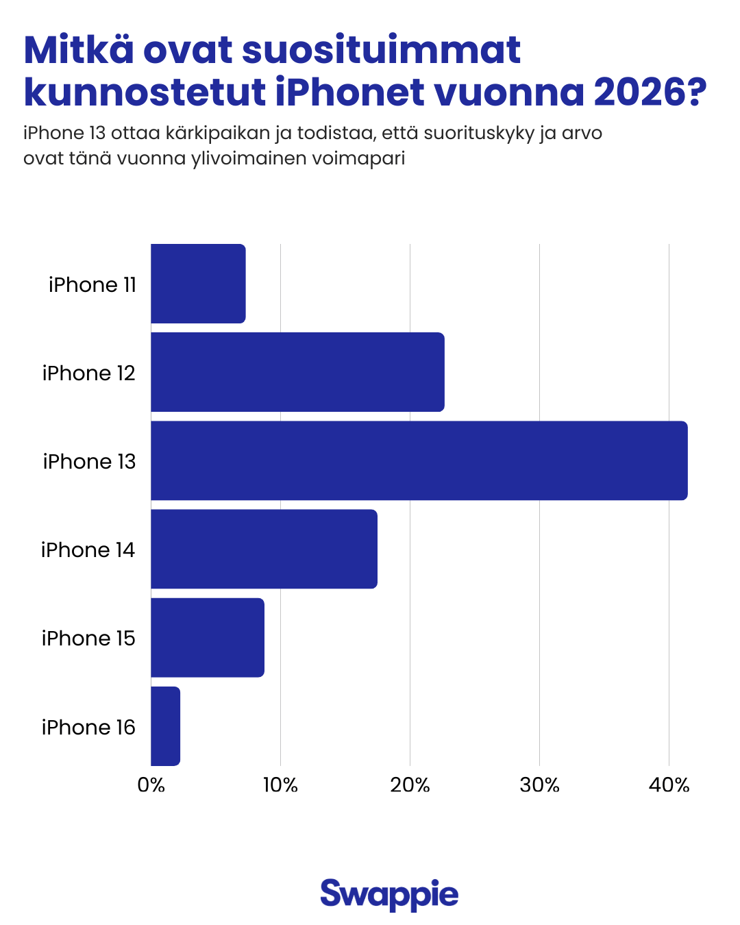 Kun katsomme laitteita, joita asiakkaamme lisäävät ostoskoreihinsa, yksi malli nousee selvästi ylitse muiden. iPhone 13 on tällä hetkellä Swappien asiakkaiden suosituin valinta, ja vieläpä huomattavalla marginaalilla.