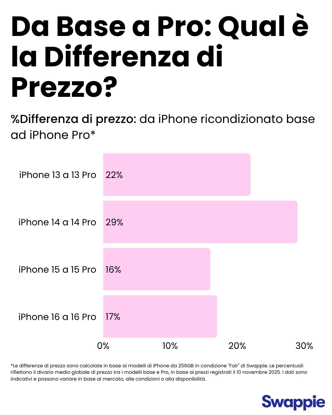Passare a un Pro non significa raddoppiare il prezzo. Quando acquisti un ricondizionato, il salto è più piccolo di quanto pensi. E se aggiungi i soldi della tua permuta, un modello Pro diventa una scelta semplice e intelligente. La tabella qui sotto mostra quanto devi spendere in più, in termini percentuali, per passare da un iPhone ricondizionato standard alla sua versione Pro.