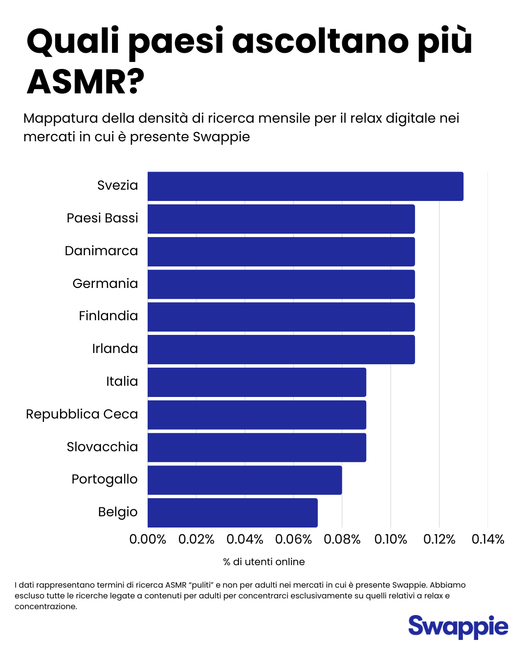 Mentre la Germania vince per volume assoluto con oltre 86.000 ricerche mensili, la storia cambia se guardiamo alla densità di interesse. Risulta che i nostri fan in Svezia sono i veri campioni del massaggio cerebrale, con la più alta percentuale di utenti online che cercano contenuti ASMR.