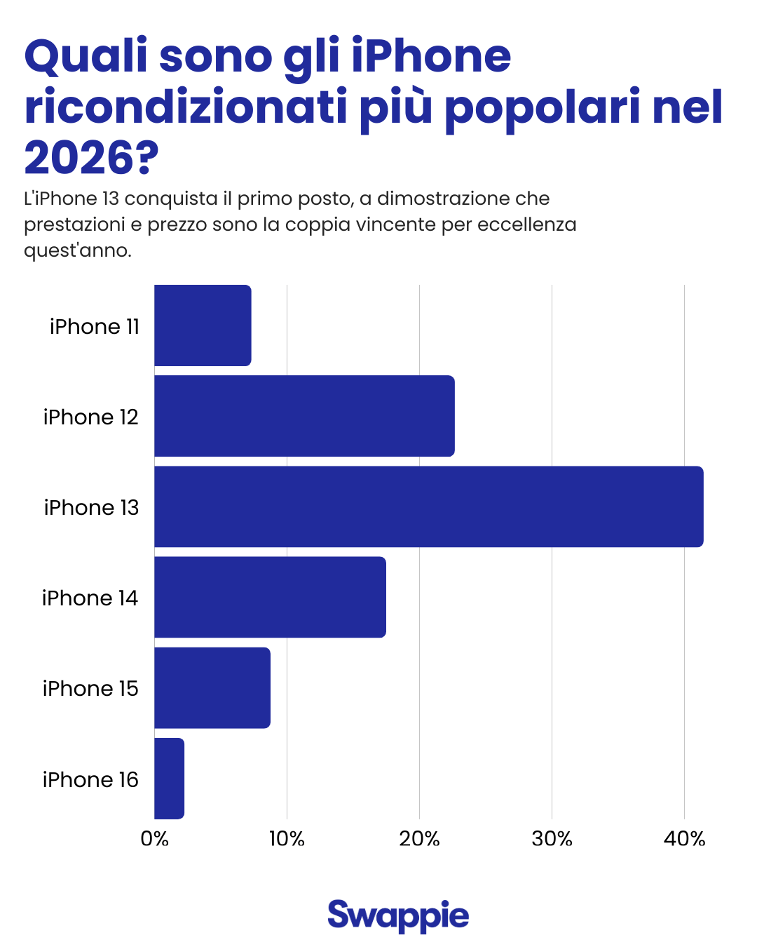 Quando guardiamo i dispositivi che i nostri clienti aggiungono al carrello, un modello spicca su tutti gli altri. iPhone 13 è, attualmente, la scelta più popolare tra i clienti Swappie, e con un margine significativo.