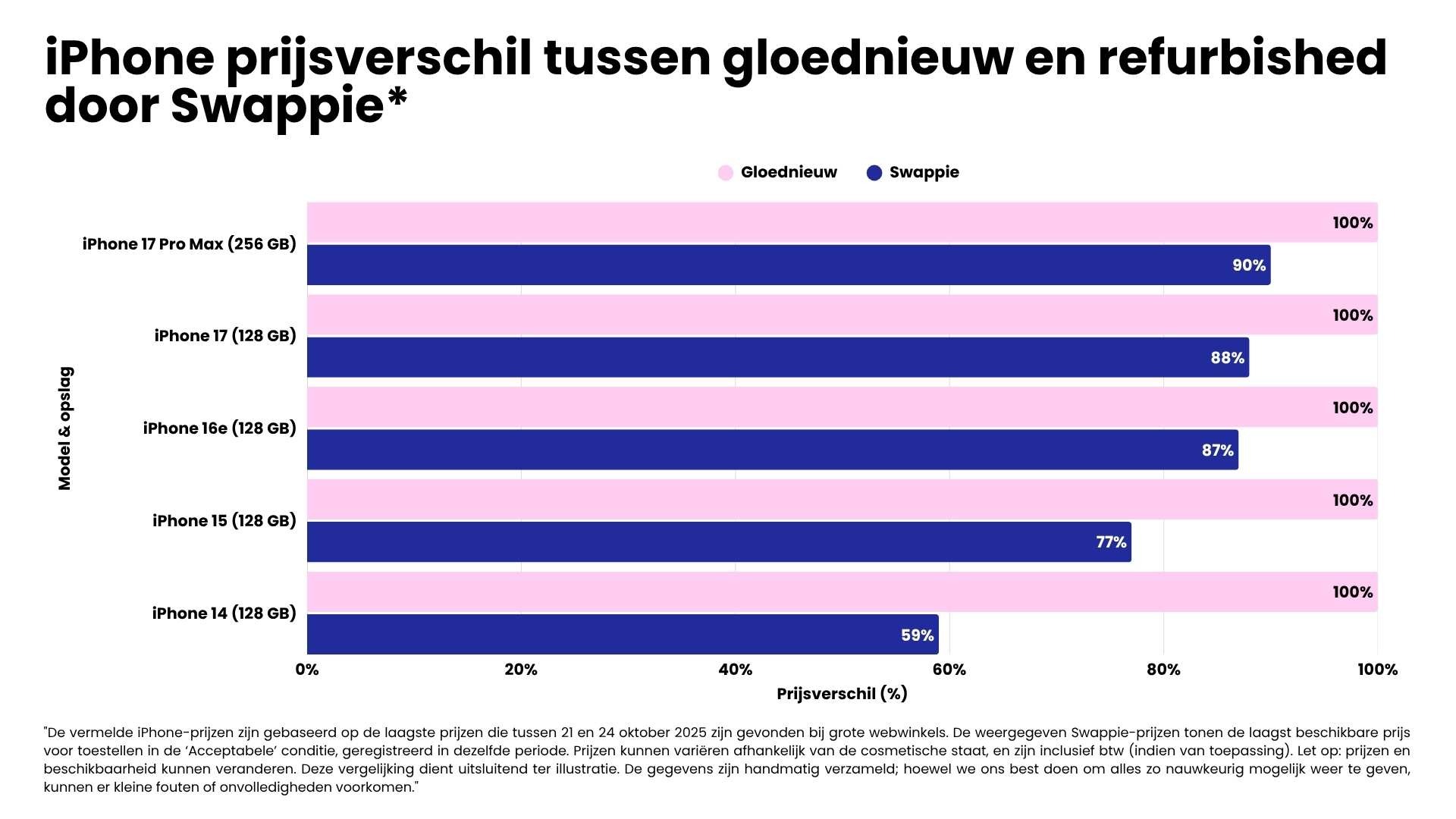 De vermelde iPhone-prijzen zijn gebaseerd op de laagste prijzen die tussen 21 en 24 oktober 2025 zijn gevonden bij grote Nederlandse webwinkels. De weergegeven Swappie-prijzen tonen de laagst beschikbare prijs voor toestellen in de ‘Acceptabele’ conditie, geregistreerd in dezelfde periode. Prijzen kunnen variëren afhankelijk van de cosmetische staat, en zijn inclusief btw (indien van toepassing). Let op: prijzen en beschikbaarheid kunnen veranderen. Deze vergelijking dient uitsluitend ter illustratie. De gegevens zijn handmatig verzameld; hoewel we ons best doen om alles zo nauwkeurig mogelijk weer te geven, kunnen er kleine fouten of onvolledigheden voorkomen.