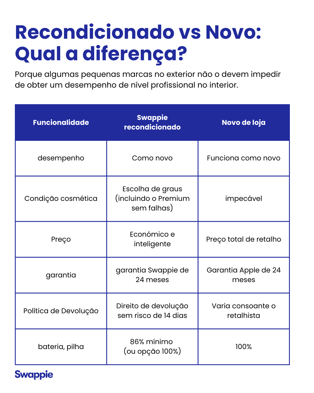 Num mundo onde a nova tecnologia tem um preço elevado, está na hora de falar sobre o que realmente importa: o desempenho. Na Swappie, acreditamos que todos merecem tecnologia com a qual se sintam bem. É por isso que os nossos iPhones têm um desempenho tão bom como os que encontraria numa loja tradicional.