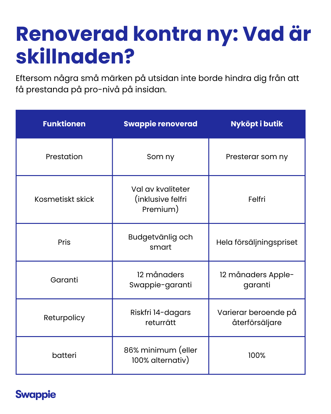 3. Lagring Lagring fungerar exakt likadant oavsett om mobilen är ny eller refurbished. En 128GB Swappie-iPhone ger samma snabba dataåtkomst och kapacitet som en direkt från fabriken.