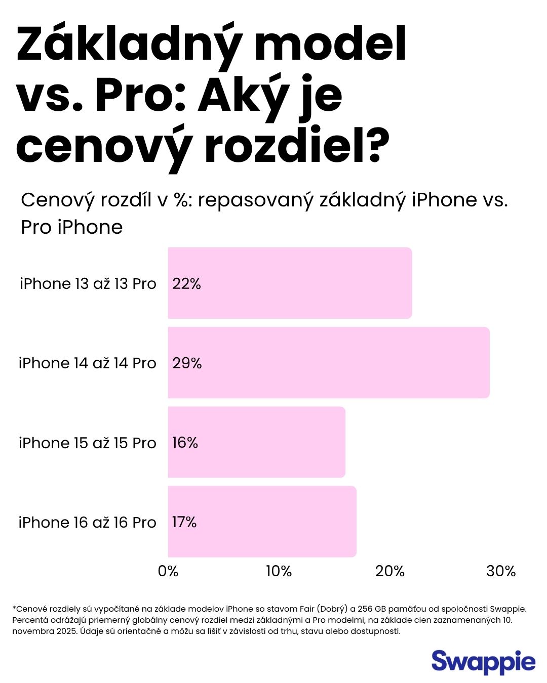 Vyhlásenie: Toto porovnanie používa priemerné globálne ceny Swappie (k 10. novembru 2025) pre repasované modely v stave „Dobrý“ s 256 GB úložiskom. Poskytuje vám rýchly prehľad nákladov na inováciu naprieč sériami iPhone 13 až 16.